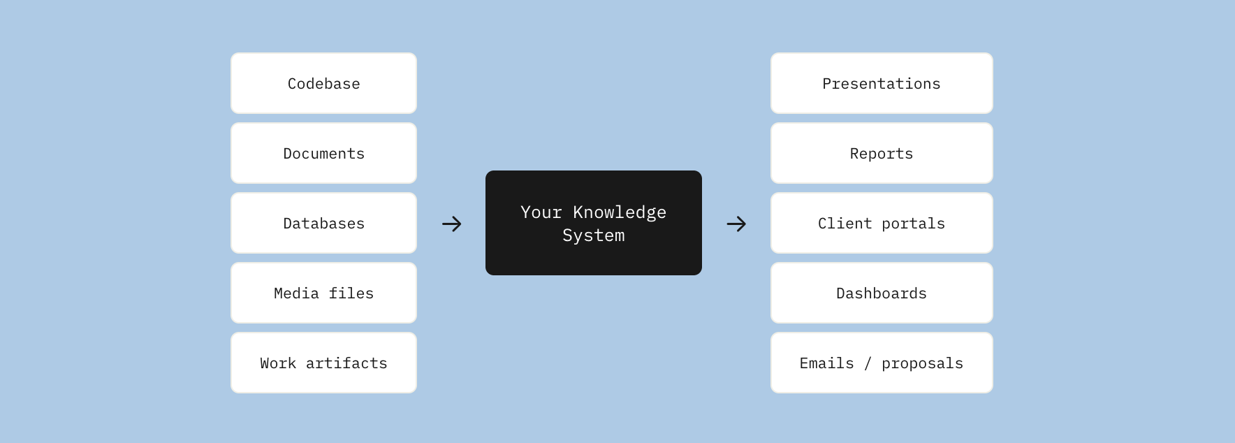 Presentations become views on knowledge. Reports, client portals, dashboards, and internal wikis follow. Once a well-architected pipeline exists with content in accessible formats, knowledge becomes a working asset rather than dormant files.