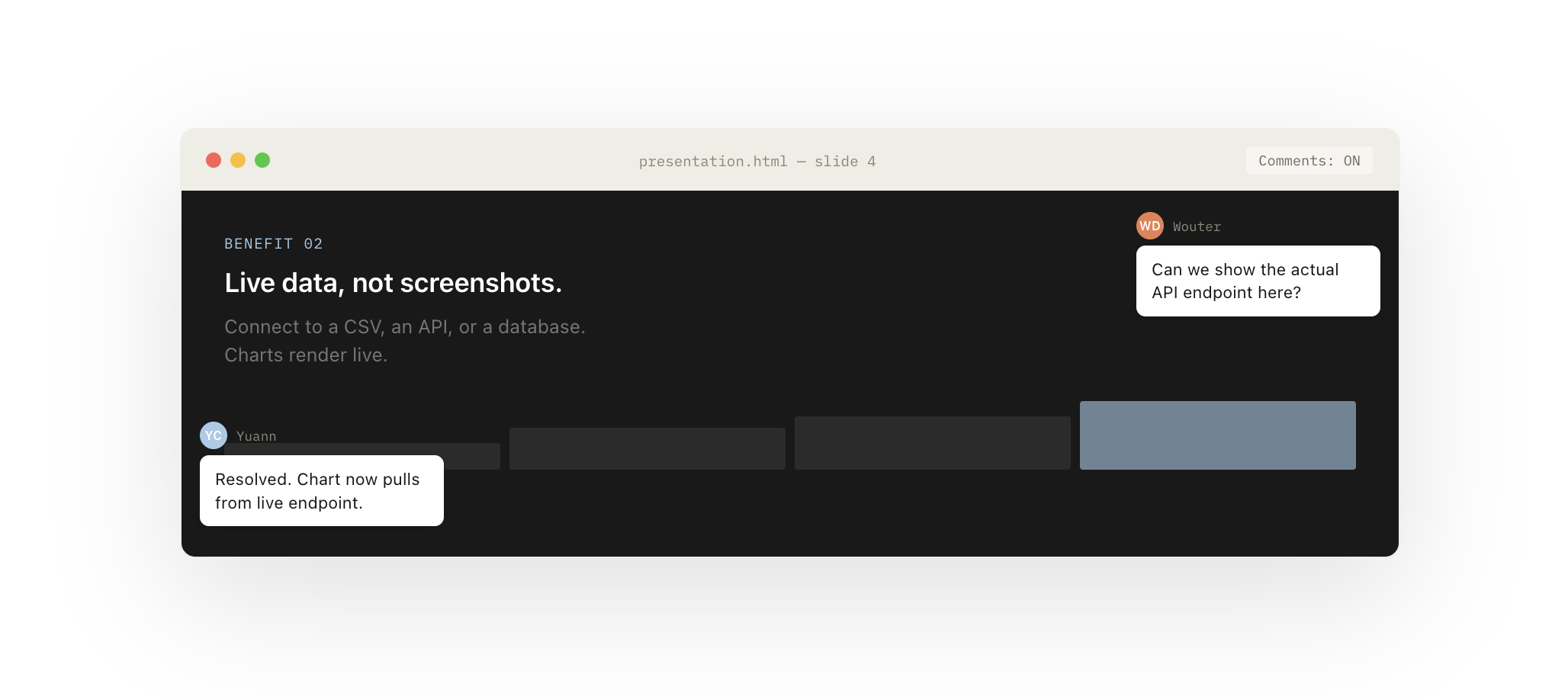 However, collaboration can be redefined. Since AI agents construct presentations, commenting workflows can be built into instructions, generating consistent, Figma-style comment bubbles directly on slides. Viewers toggle comments on/off without additional tools or accounts.