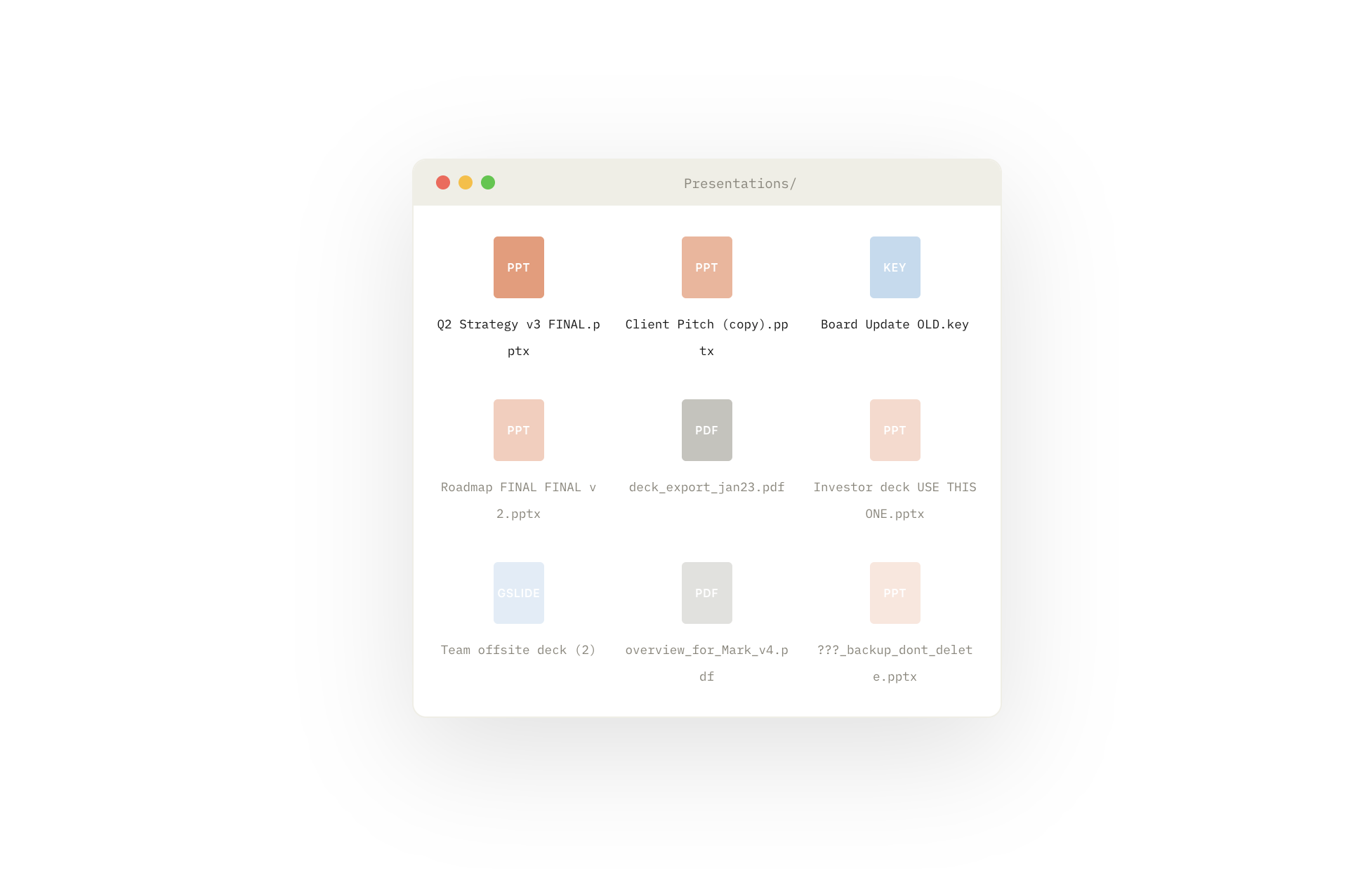 A new approach to presentations where the content stays alive, the design stays consistent, and every deck becomes a reusable asset.