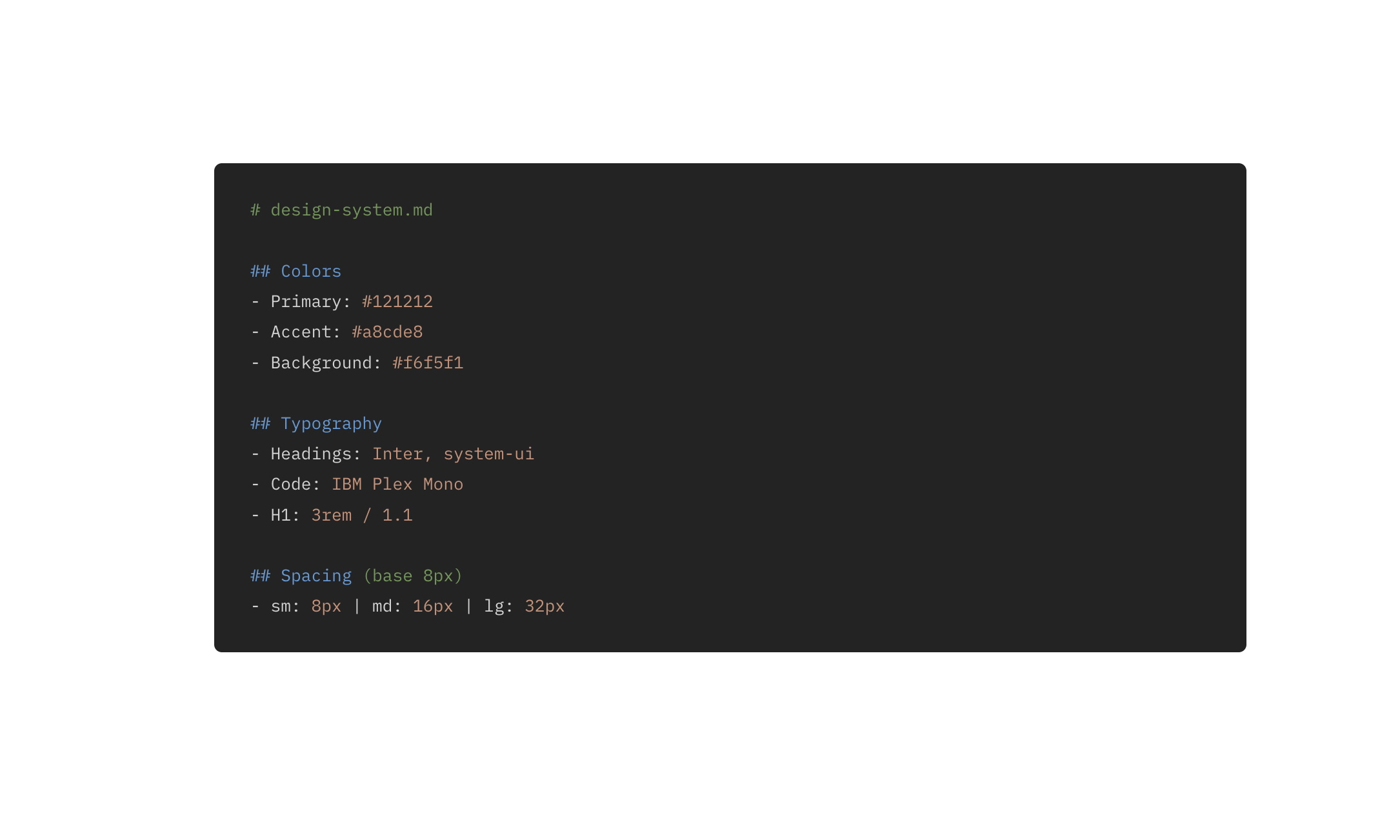 With the HTML approach, define your design system once in a text file: colors, typography, spacing scales, layout rules — all in one location.