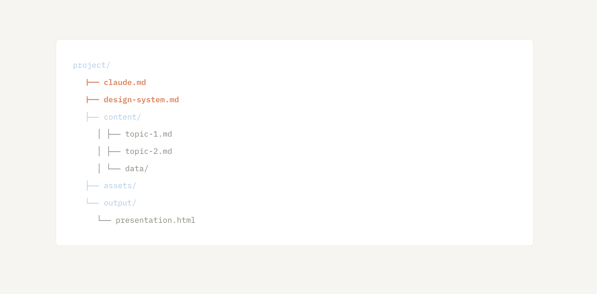 content/folder (or use placeholder text) - Ask Claude Code: "Build a presentation from this project's content"