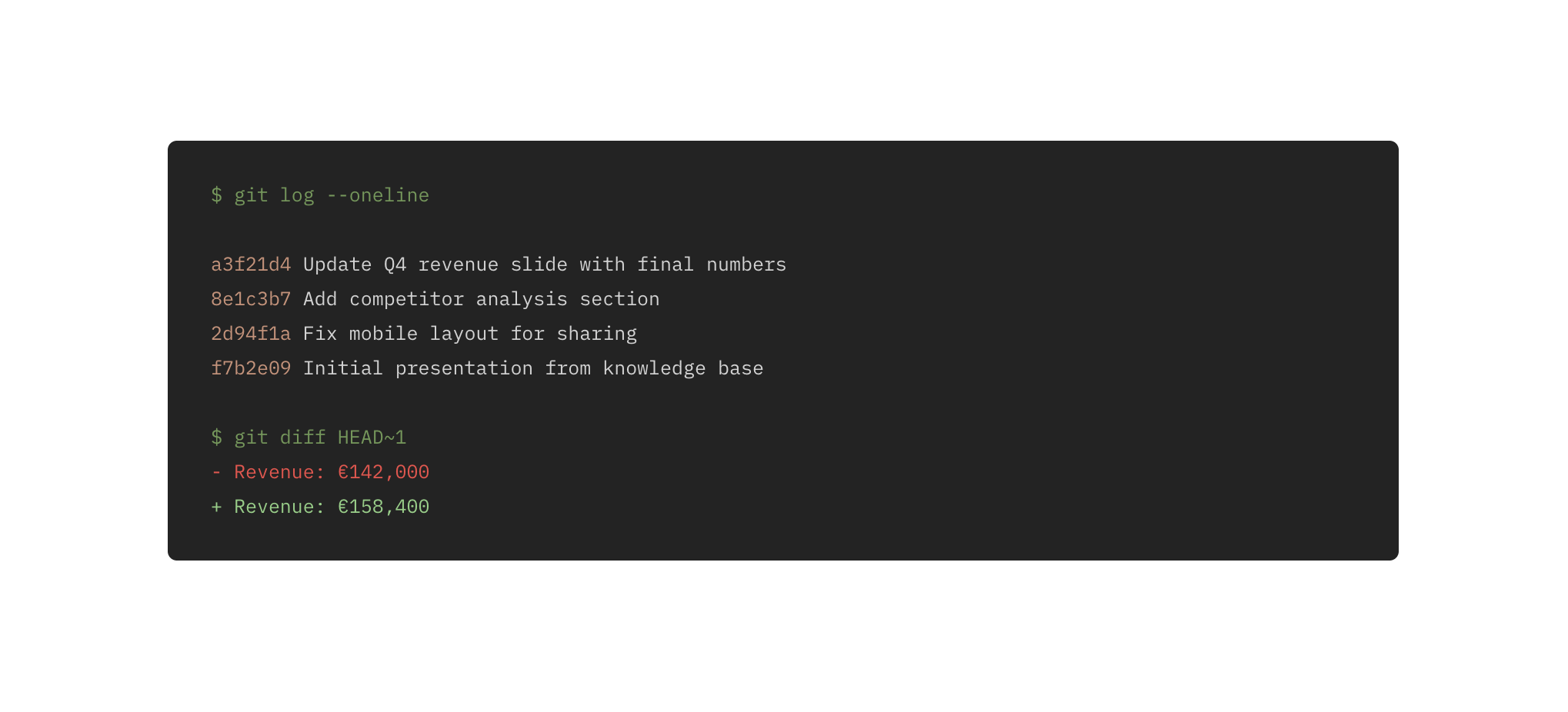 When presentations pull from source files — whether Notion, markdown knowledge bases, or shared folders — this problem disappears. Knowledge exists in one location, with presentations serving as views on top. Updating the source and regenerating the page eliminates copy-paste drift and outdated decks.