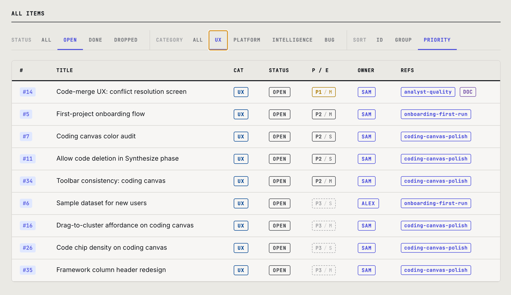 We built a working example: a complete project dashboard as a single HTML file. It holds the project brief, workflow phases, backlog, design documents, and team roster, all in one page, all linked. Click any backlog item to read its note or full design doc without leaving the page. Filter and sort by status, category, or group.